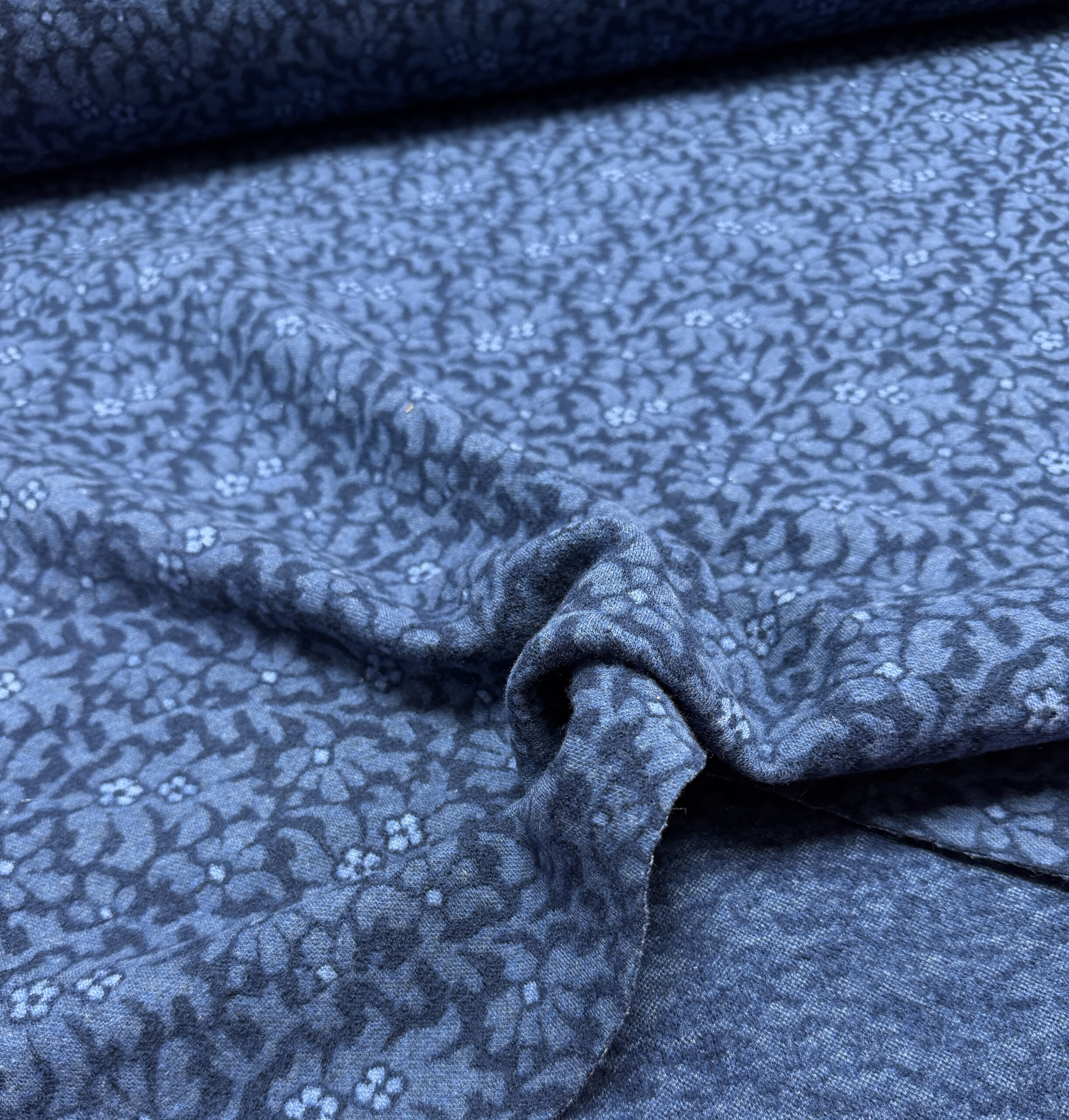 Jaquardstrikket jerseystoff av ull/bomull-blanding. Stoffet er ferdig vasket og vil ikke krympe.
