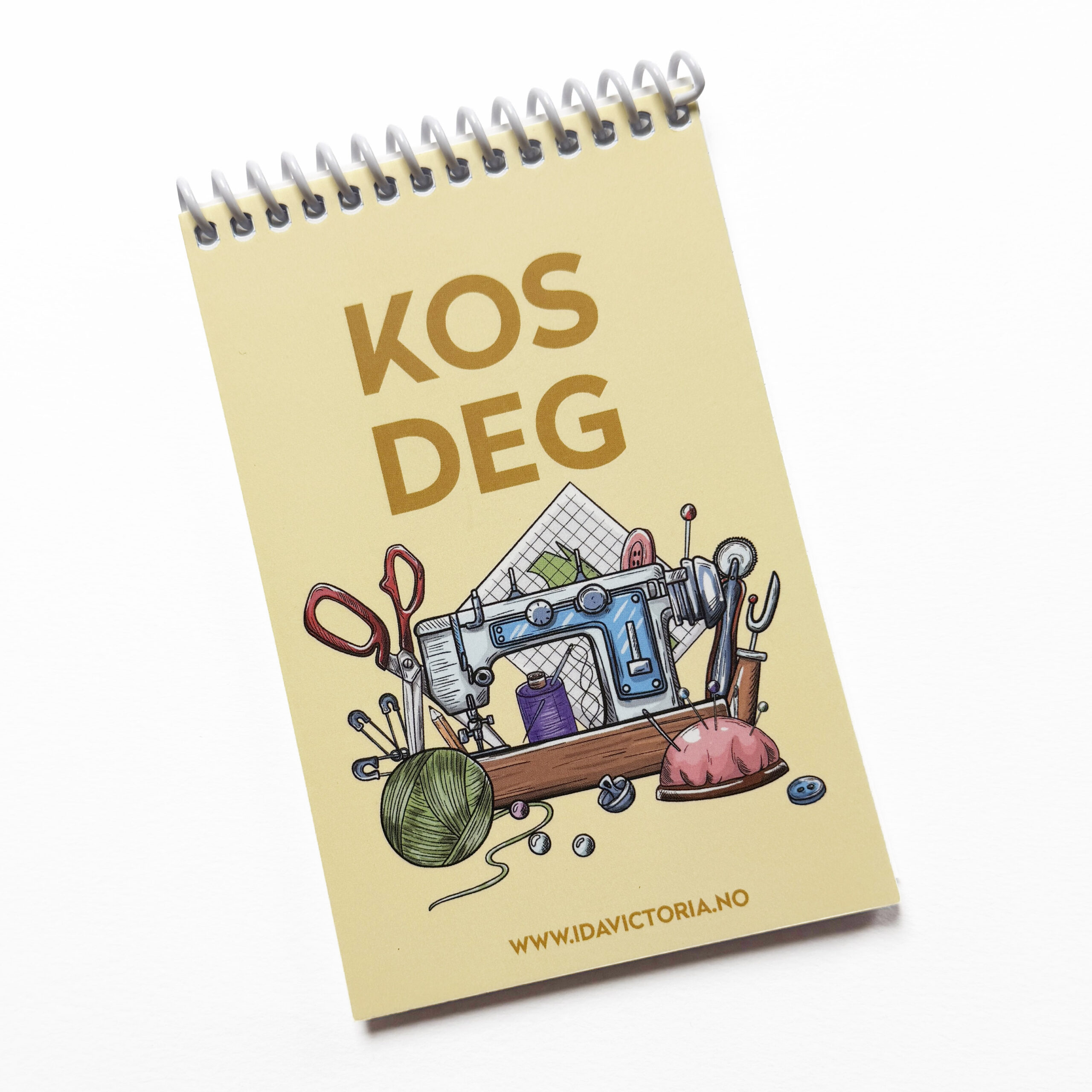 Liten linjert notatbok med teksten KOS DEG på forsiden, sammen med ulikt sytilbehør.