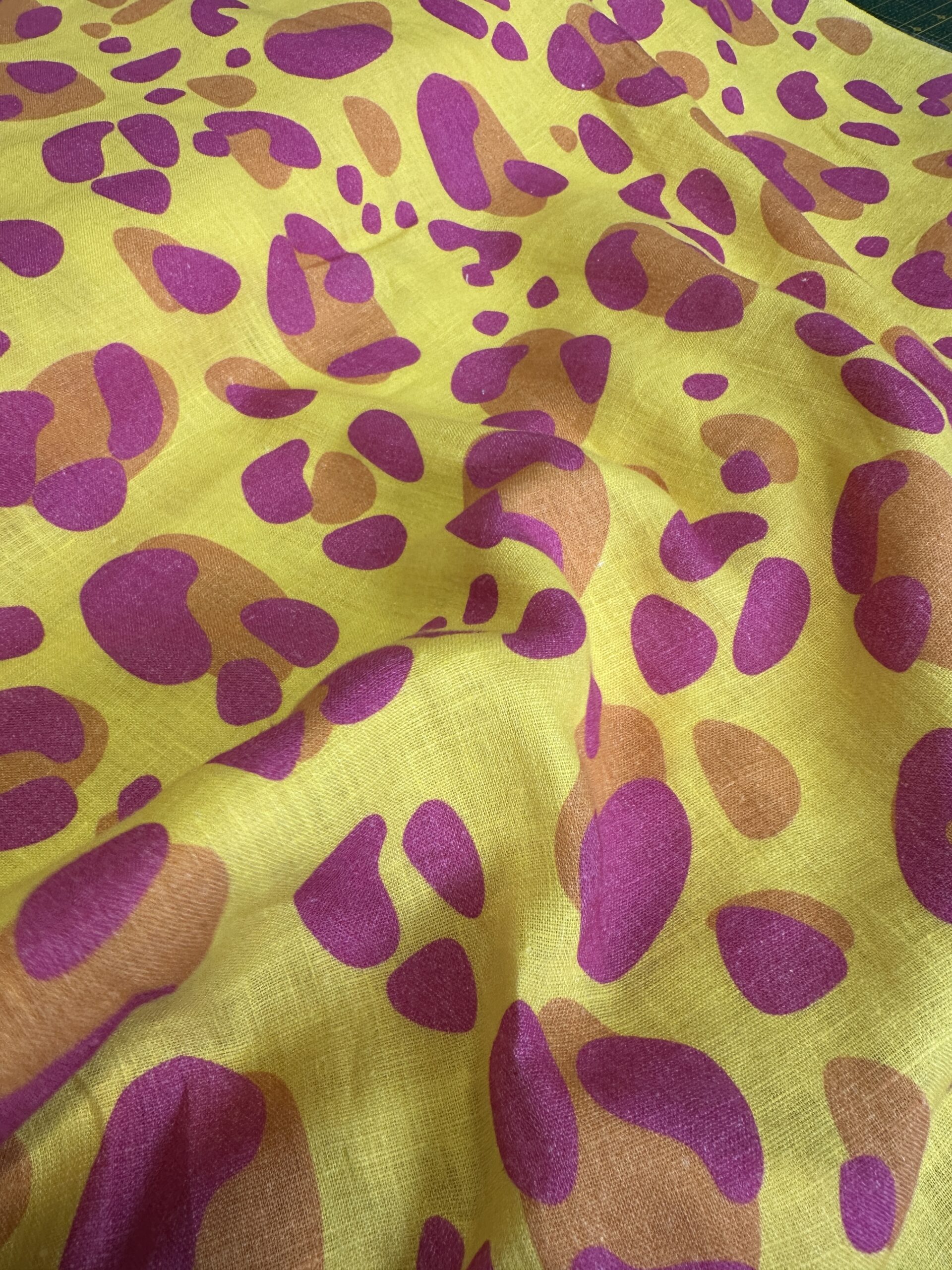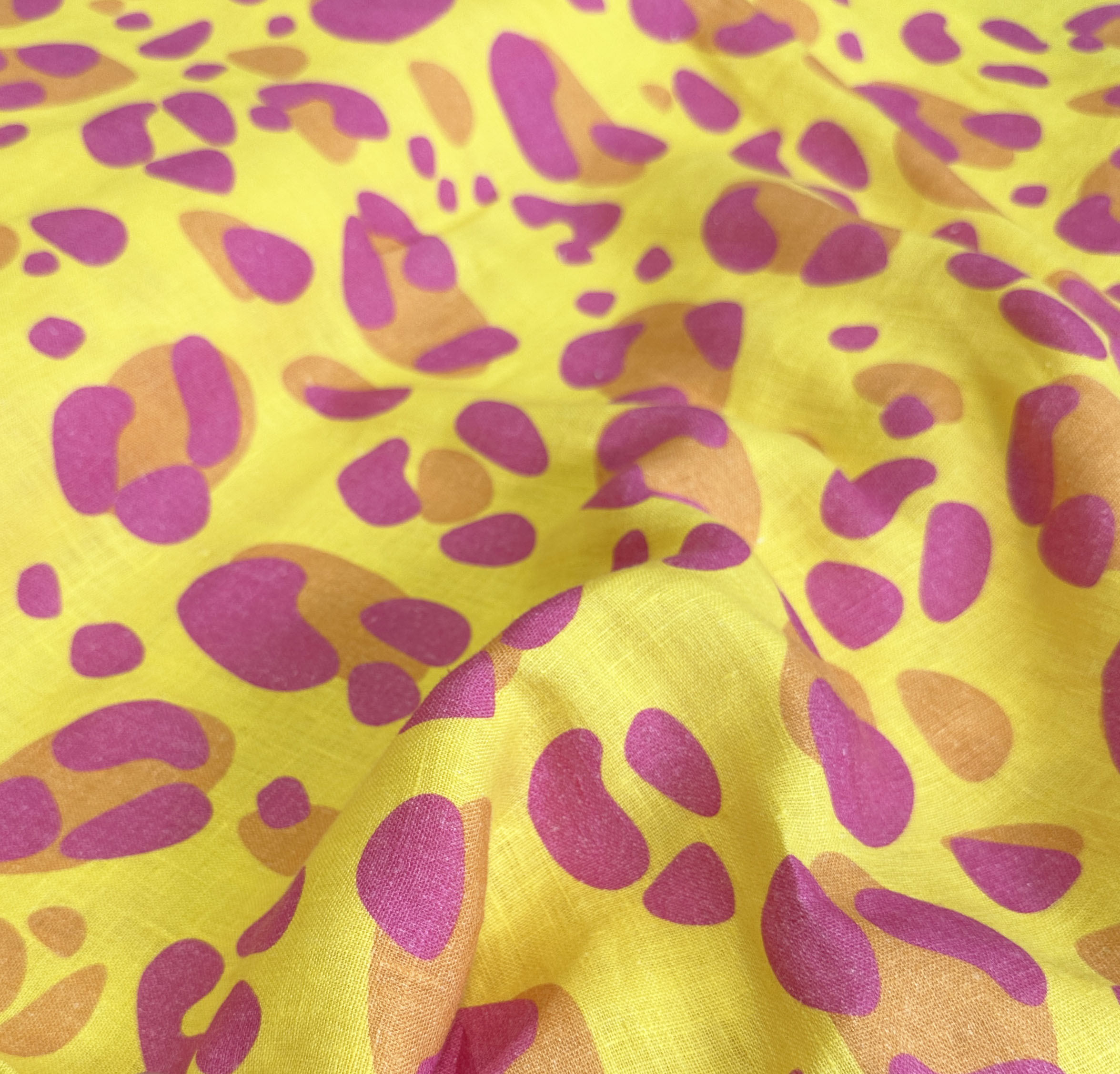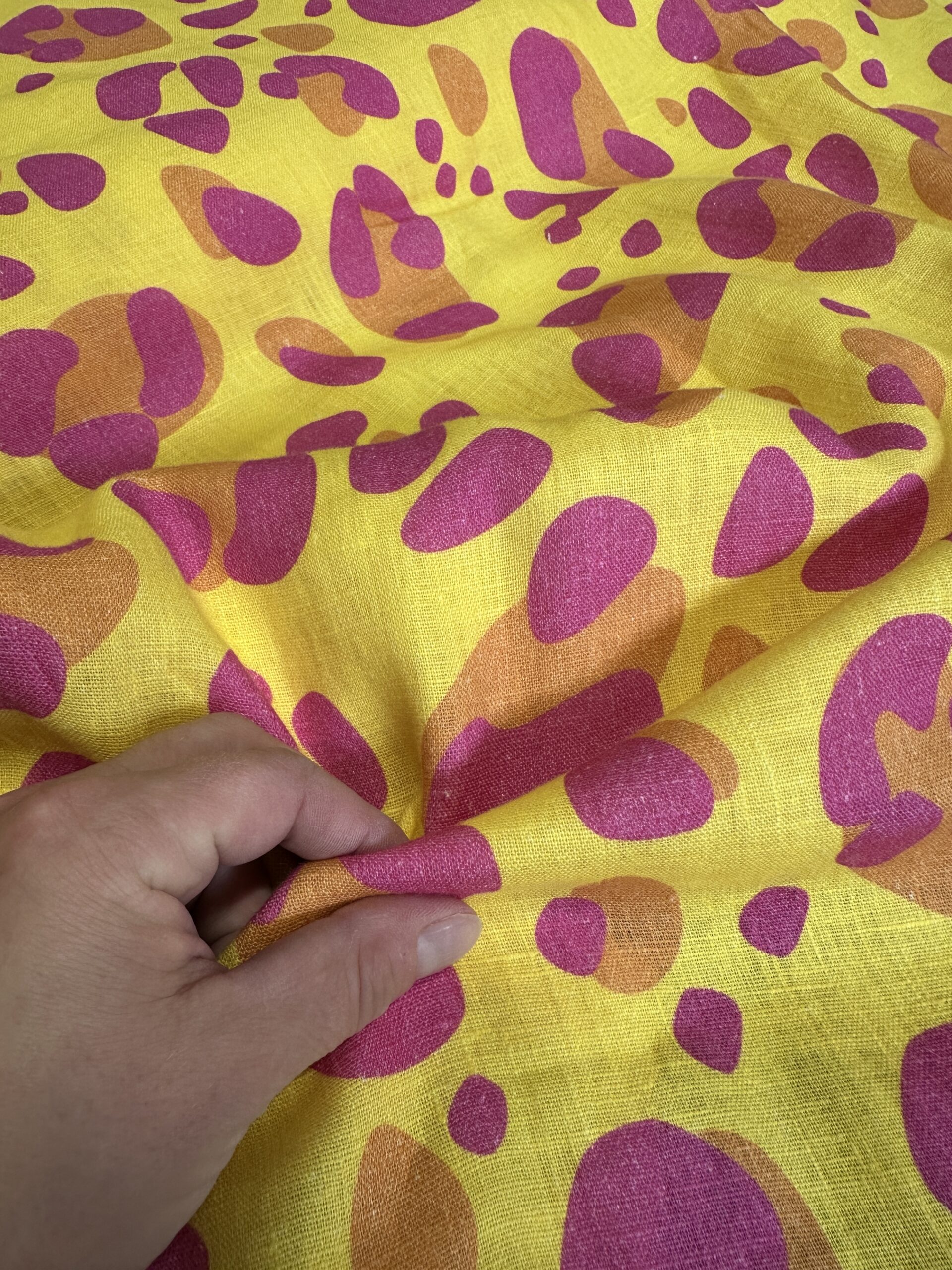 OBS! Linens natur gjør at det er noen hvite «rusk» i stoffet, som det er vanskelig å unngå med mørkere/heldekkende trykk. Dette er imidlertid ikke spesielt skjemmende, og fordi lin ofte er litt ujevnt blir dette en del av «linlooken». Fargene kan avvike noe fra det du ser på skjermen til de trykte fargene på tekstilene.
